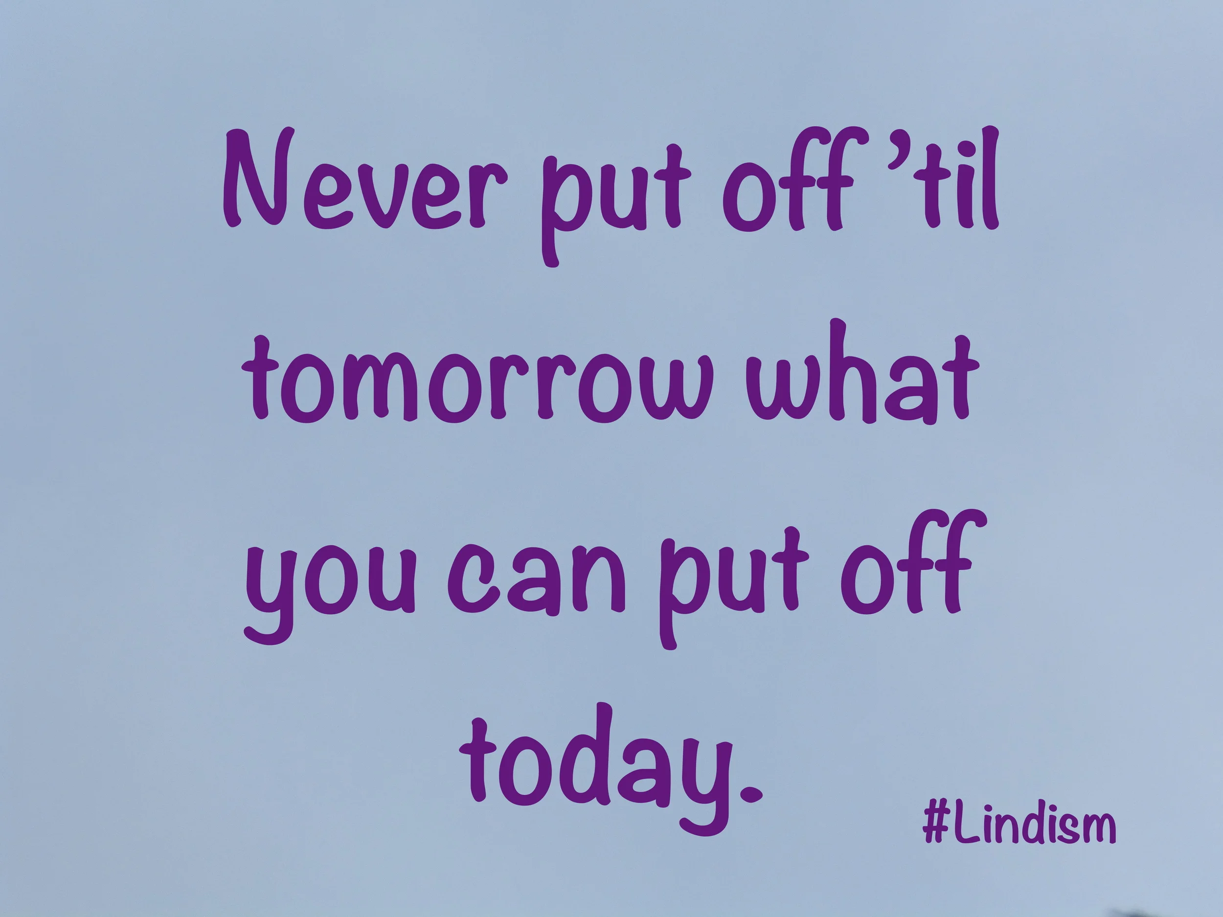 Today's Lindism is play on "Never put off 'til tomorrow what you can do today." The original cautions its readers to act now rather than later, while my Lindism pokes fun at procrastination by suggesting that you do it tomorrow.