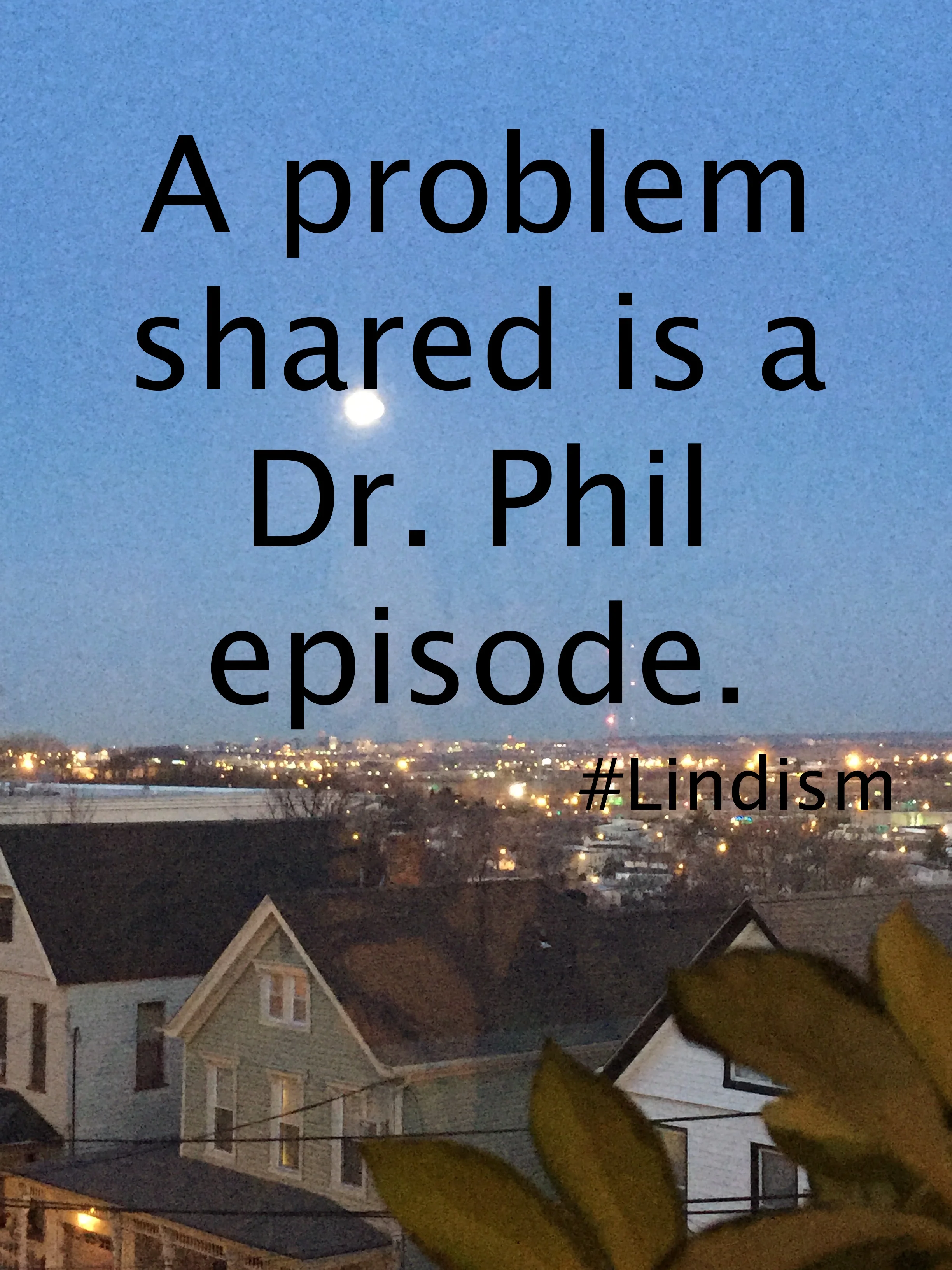 Today's Lindism is a play on "A problem shared is a problem halved" which is to say that sharing a problem splits it in half. The Lindism twist says that sharing a problem is what makes up a Dr. Phil episode.