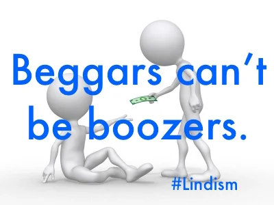 Today's Lindism is built from "Beggars can't be choosers" which is to say that if a person asks for something, the giver gets to decide what's given. It's not for the "beggar" to choose. In my twist, I cite a popular criteria we use to determine if we're going to give. "If a beggar looks like he's going to spend on drinking or drugging, I don't want to support that", we'll say.