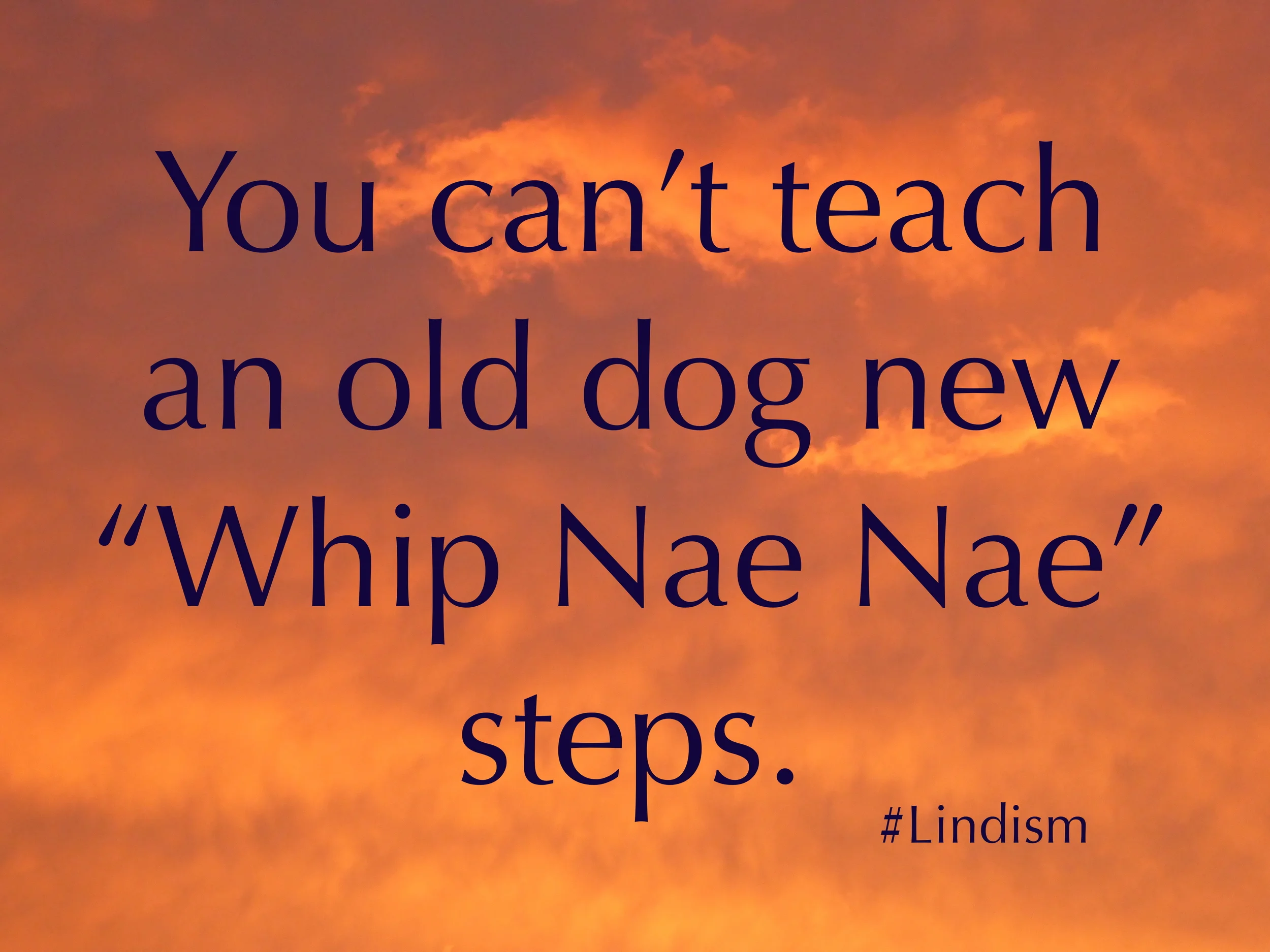 Today's Lindism is a riff on "You can't teach an old dog new tricks." The original cautions that the "old dog" can't learn new ways. In my twist, I'm toying with this past summer's trend of people doing their Youtube version of a dance/song called "Whip Nae Nae." Some people went so far as to try to get their pets in on the trend.