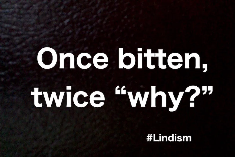 Today's Lindsim plays on the expression, "Once bitten twice shy" which is to say that if you have a bad experience with someone or something you'll shy away from it a second time. In my twist, I'm supposing that something that "bites" you the first time should have kept you from acting a second time but it didn't and now one asks "why?"