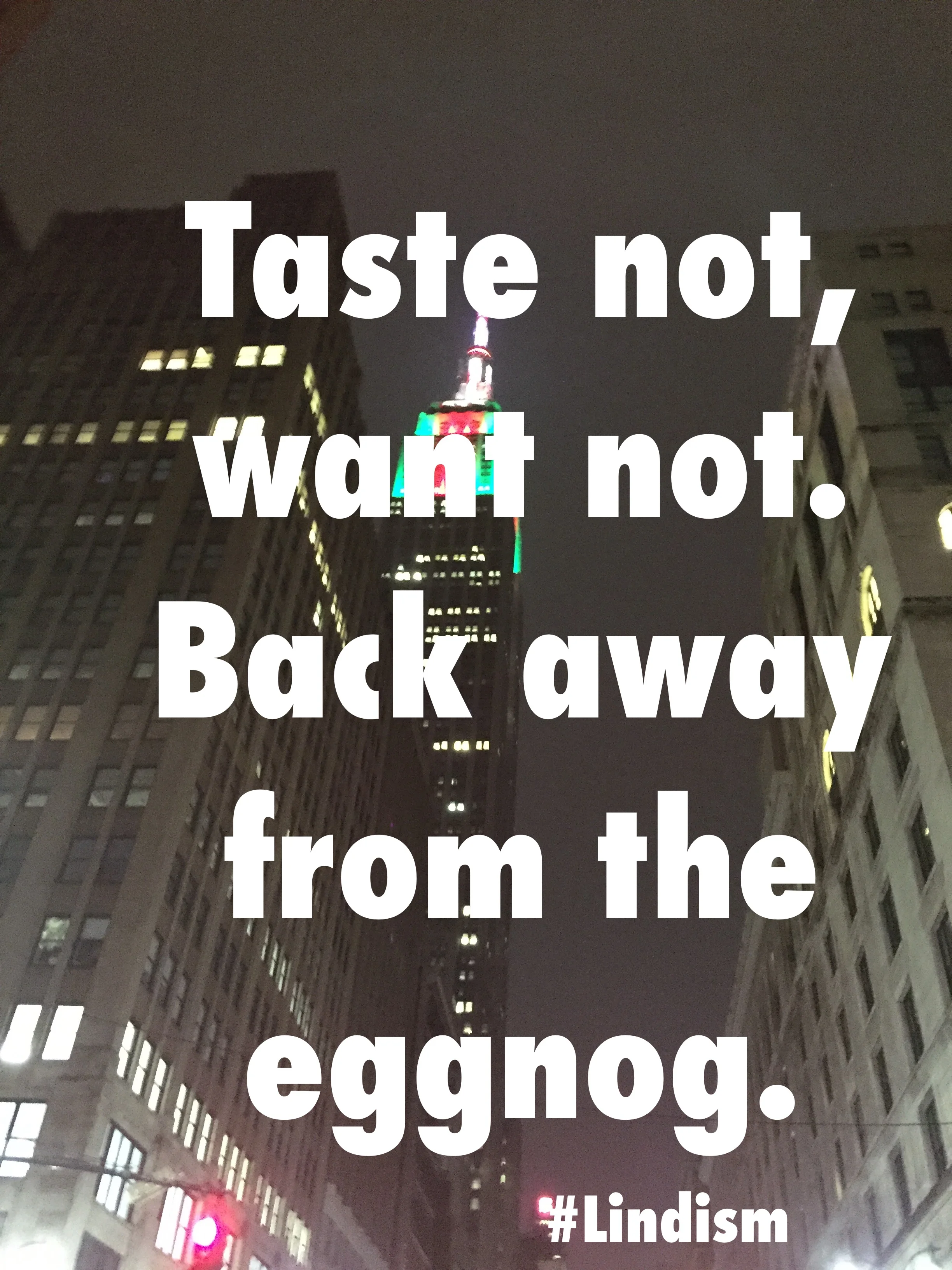 This Christmas Lindism plays on the saying, "Waste not, want not" which is a directive not to waste so that you'll not be in need. The Lindism plays on our desire to have eggnog during the season and cautions against tasting it to avoid wanting it.